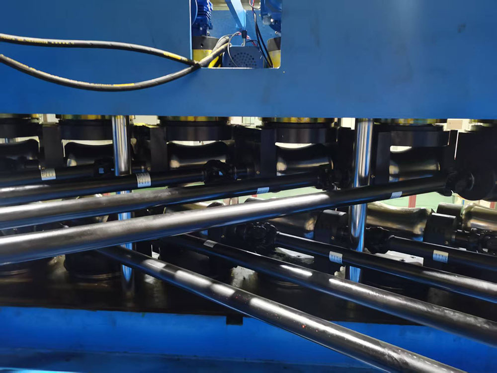 本機十二個輥輪呈2-2-2-2-2-2配置形式,由電機經(jīng)齒輪分配箱減速后通過萬向聯(lián)軸器驅(qū)動。十二個矯直輥分上下兩排水平交叉布置,矯直輥軸線與矯直中心線成一定角度轉(zhuǎn)動,管材在上下輥之間沿矯直中心線作直線運動及旋轉(zhuǎn)運動,從而使管子的任一表面得到碾壓和彎曲。